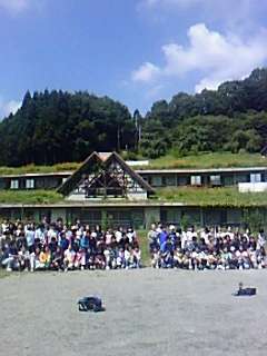 なかのビレッジ到着です。全員で写真をとりました。なかのビレッジはかわった建物です。山と一体化しています。i