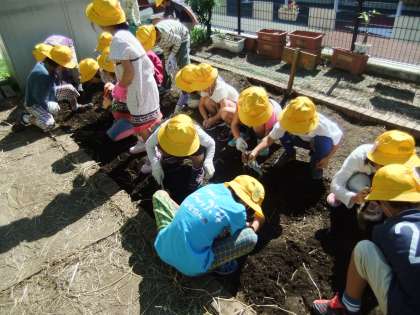 ヒャクニチソウやヒマワリ、マリーゴールド等の花を植えていた畑を耕しました。次は10月10日(木)に、畑の先生をお招きして小松菜を植えます。収穫は冬の足音が近付いてくる頃です。子どもたちは一生けん命に耕しました。ときどき、幼虫さんとこんにちわをし、歓声をあげていました。