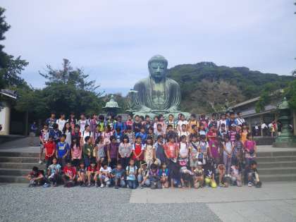 ハトサブレの形は鶴岡八幡宮の八の字の形からとったそうです。大仏で集合写真です。帰りは由比ヶ浜まで歩き海を見て帰ってきました。(校長 箭内)