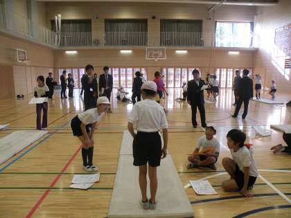 子どもたちは一生懸命前転、後転の基本的な運動に取り組んでいました。講師は前用賀小学校長 内藤 信先生です。多数の参観する先生の中で子どもたち、久保先生が頑張っていました。(校長 箭内)