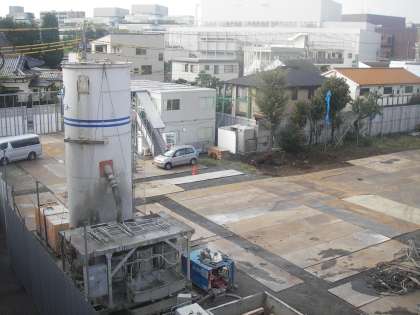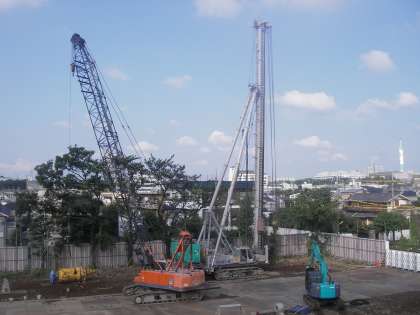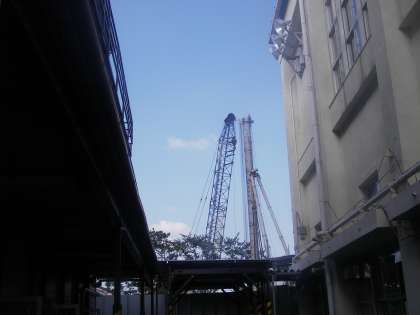昇降口から校庭の方向をみると大きなクレーンが見えます。改築工事で杭打ちが始まったのです。大事な基礎がためです。左方向にある円柱にはセメントと書いてあります。着々と進んでいます。早く出来上がってほしいです。