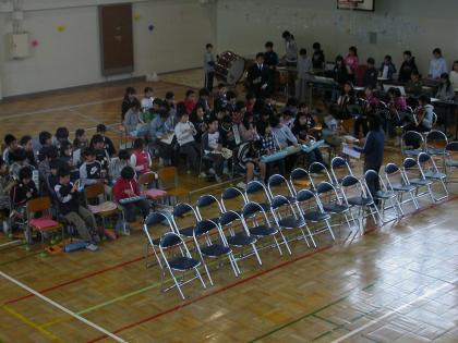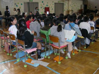 卒業式の練習が本格的に始まりました。在校生の代表として、5年生が式に出席します。5年生にとっては、初めての経験です。緊張した表情で、練習に入りました。入場曲や退場曲の練習が中心です。
