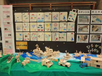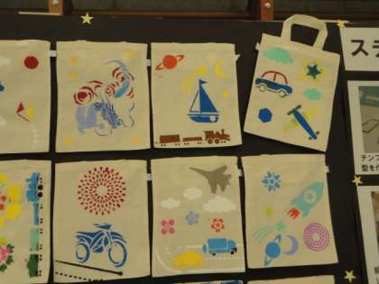 「ひろがれ ひろがれ」と題した、ステンシルの手提げと木工作品の展示です。子どもたちの発想が広がり、一つ一つの作品に表れています。