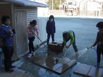 月に一度の委員会の日には、小屋の中にあるすのこを入念に洗います。その間は第二校庭へ行って、ココアを自由にさせてあげます。