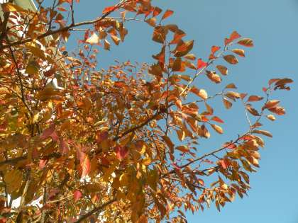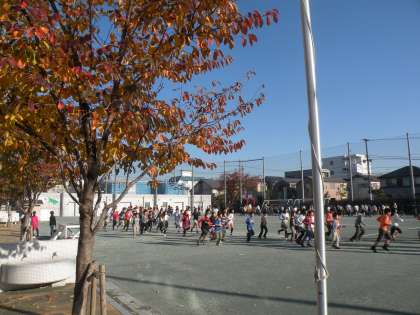 校庭の桜の木が紅葉しています。風が吹くたびにはらはらと葉を落としています。校庭では朝マラソンです。少し寒いくらいがマラソンにはちょうどいいのです。体力向上に頑張っています。(校長 箭内)
