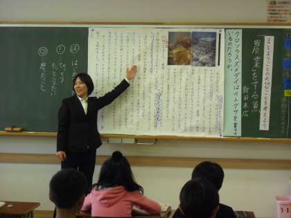 本日、校内研修で3年1組が、国語『「農業」をする魚』で授業を行いました。活発に意見を発表する子どもたちの姿には、学習に対する意欲を感じました。