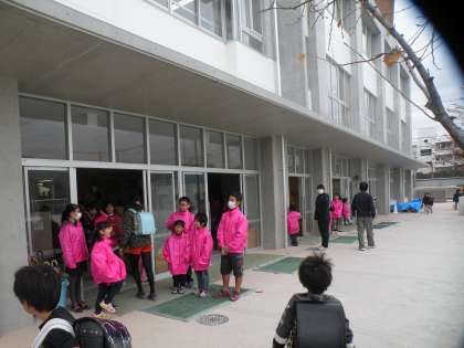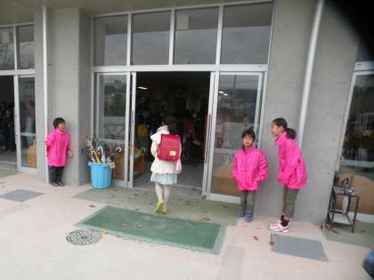 今週の挨拶プロジェクトは1年2組と6年生です。大きな学び舎のピンクのジャンパーを着て昇降口に立ち、元気に挨拶しています。1年生が元気にあいさつ姿はなかなかかわいいのです。