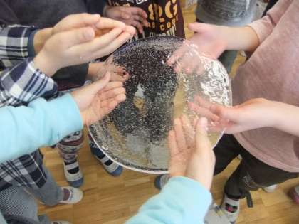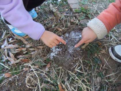 暦の上では春ですが、今日は大変に冷え込みました。中庭に、水を入れたバケツを出しておいたところ、大きな氷ができました。皆、自分の顔より大きな氷を持って歓声を上げていました。その後、第二校庭に出てみると、霜柱があったり、土がシャリシャリと音がしたりと、寒い冬ならではのことをたくさん見つけることができました。