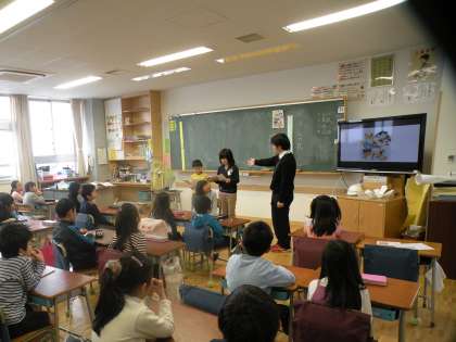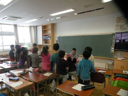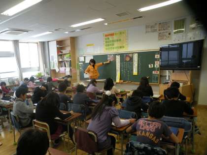 3年生は主題「信頼友情」、資料は「たまちゃん、大好き」です。紙芝居のように読み聞かせをしたり、絵を使いすすめたりと工夫をしながら授業を進めています。