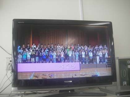 8日の音楽朝会は、テレビで行いました。3年生の体育館での発表をビデオで撮り、それをテレビで流しました。リコーダー「笛星人」「さくらぶえ」「小川」の演奏がテレビから流れてきます。インフルエンザの感染拡大を防ぐための対応です。区内ではまだまだ