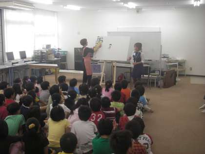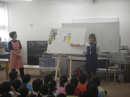 今日の2校時は、読み聞かせです。図書館から4名のスタッフが来てくださり、2年生に読み聞かせをしてくれました。ペープサート、大型かみしばい、パネルシアターと様々に工夫を凝らしお話をしてくれました。楽しいひと時でした。