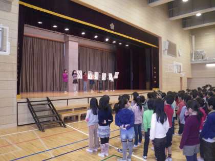 今日の全校朝会では、学び舎生徒会の報告がありました。代表委員が用賀中学校に行き合同生徒会で話し合いをしてきたのです。その報告でした。生徒、子どもたちでおはコミや地域清掃などの活動をしています。さらに様々な活動ができるといいなあと考えています。