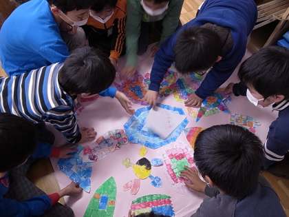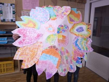 今日の五年生は、体育館の装飾用にお花の飾りを作りました。一人ひとりが作った花びらを集めて、みんなで一つの花にします。どんな形に並べるか、順番や組み合わせをみんなで相談しながら楽しそうに進めていました。