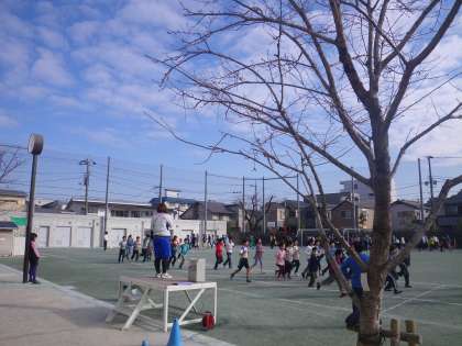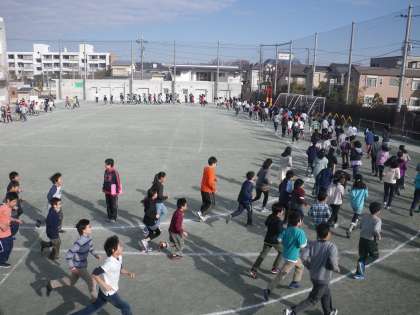 体力向上 朝マラソンはまだまだ続いています。校庭の桜のつぼみが徐々に大きくなっているのが分かります。春の足音が近づいています。