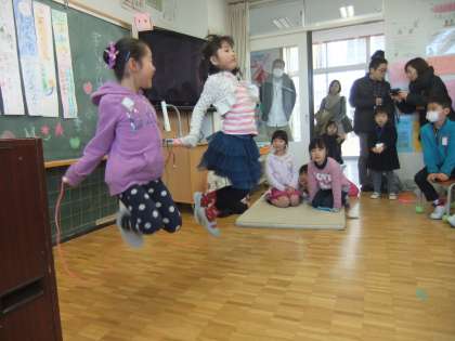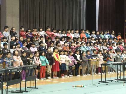 学習発表会を行いました。前半は、体育館で「きらきらぼし」の合奏、「雨にもまけず」の群読、「さくら組」を、手話をしながら歌いました。後半は各教室で、一人一人が発表することを考えて皆に見てもらいました。お手玉やあやとりといった昔遊びや、なわとび、マット等の運動、鍵盤ハーモニカの演奏。色々なかたちで一年間で出来るようになったことの発表をしました。
