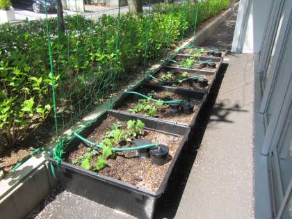 今日、京西小学校にグリーンカーテンが設置されました。場所は、校舎の西側、会議室のある壁面です。ゴーヤ、キュウリ、ヘチマの苗が植えられました。どの位育ってくれるのでしょうか。楽しみです。〈校長 箭内〉