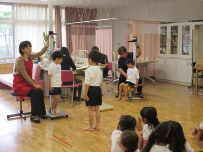 1年生が、発育測定をしています。身長、体重、座高を測っています。発育測定は、子どもたちが健康に成長しているかをみる一つのものさしです。