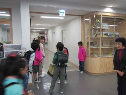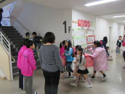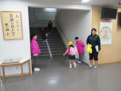 今日から京西小学校の挨拶プロジェクトが始まりました。今日は天気が悪いので昇降口の中、階段のところでみんなを迎えます。代表委員会が立って挨拶で迎えています。代表委員会が先頭に立ち挨拶プロジェクトを進めているのです。〈校長 箭内〉