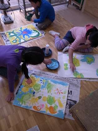 6年生の図工では、植物の色や形を通して自分の気持ちを表す「感じたままに…」という平面作品に取り組んでいます。自分でベニヤのパネルを作り、下地を塗ってキャンバスの準備から始めました。特製キャンバスに、粘土と混ぜた絵の具で自分の思いを描いていきます。