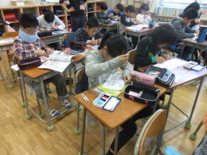 家庭科の時間に、裁縫をしました。皆、前日からとても楽しみにしていました。実際にやってみると、玉どめ、玉結び等、思ったより難しいと感じた子が多かったようですが、皆、とても楽しかったと口々に言っていました。