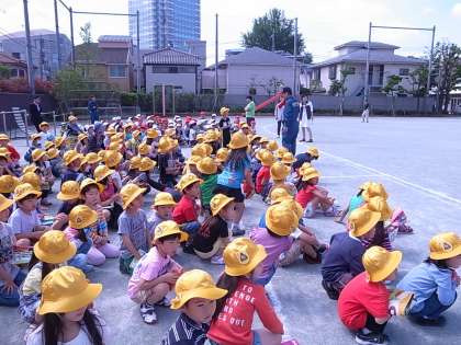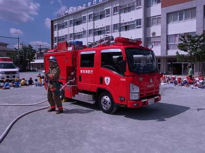 今日は学校に消防車と救急車がやってきてくれました!1,2年生合同で、消防自動車の写生会です。消防署の方が放水の様子を見せてくれたり、暑い日差しのなかポーズを取ってくれたりして、子どもたちも大喜びで一生懸命描いていました。