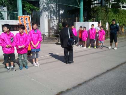 用賀小学校には用賀中学校の生徒が校門に立ってあいさつ運動をしています。用賀の街全体があいさつ運動に取り組んでいます。