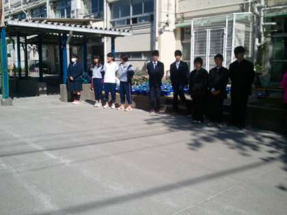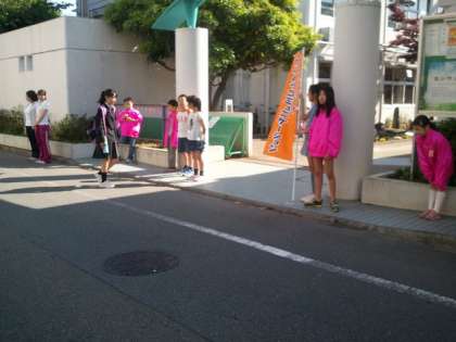 おはコミは、用賀中学校、用賀小学校でも行われています。用賀中学校には、用賀小・京西小の代表委員会の児童も校門に立ってあいさつ運動をしています。
