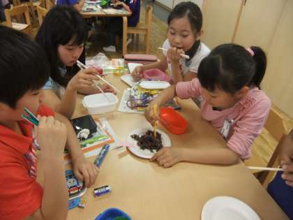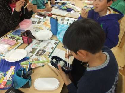 2時間目は、5種類の米を食べ比べました。国産3種類に加え、黒米(古代米)、タイ米も食べました。子どもたちは、それぞれ味に違いがあることに気付き、驚いていました。