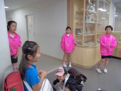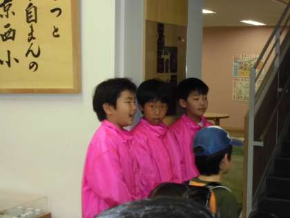 登校時 昇降口で元気よく「おはようございます」とあいさつをします。今日まで5年生の担当でした。各クラスとも3日間実施しました。あいさつが自慢の京西小学校です。自分からあいさつできるといいですね。