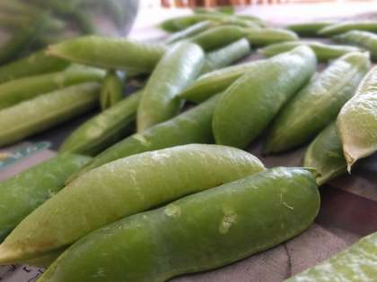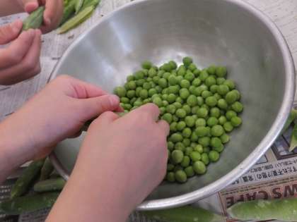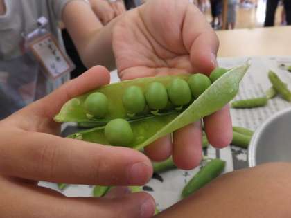 今日の給食に向け、1年生全員でグリーンピースのさやむきをしました。栄養士の先生から説明を受け、恵本の読み聞かせもしてもらいました。