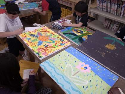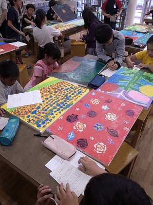 作品について質問したり、友達同士で話し合ったりしながらお互いの「いいところ」を見つけます。自分には思いつかない表現を見つけて感心したり、友達の感想を聞いて自分の作品に自信をもったりと、観賞会では子どもたち同士での学びあいがたくさんあるようです。
