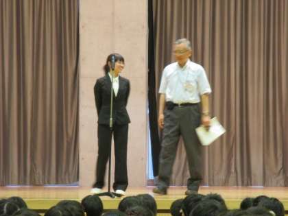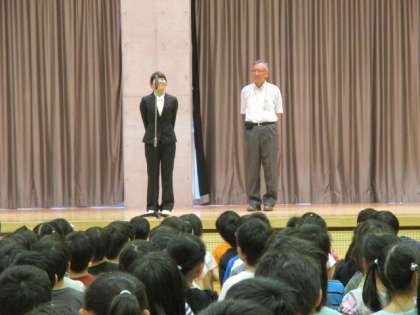 今朝の全校朝会では、校長先生のお話と、今日から3年1組に来た教育実習生の紹介がありました。