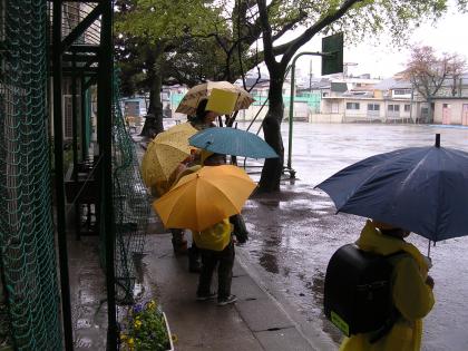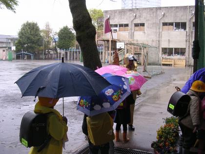 4月8日(火)、1年生はじめての方面別下校です。雨と風が少し強いので昇降口で並んでから下校しました。