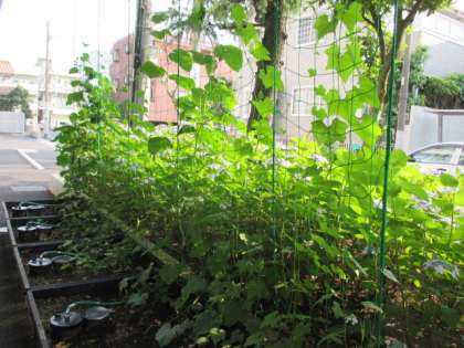 学校の東側、体育館のわきにグリーンカーテンを植えています。グリーンカーテンは、キュウリやゴーヤなど蔦が絡まるものを使って影を作り、エコに取り組むものです。