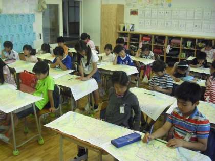 理科では、いろいろな実験器具を使って、太陽とかげについて実験を行っています。社会では、机をはみ出すほどの大きな世田谷区の地図を使って、世田谷区の特徴を探し、発表し、教えあっています。今月末には社会科見学もあるので、さらに興味を持って学習に取り組めるといいです。