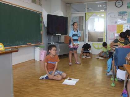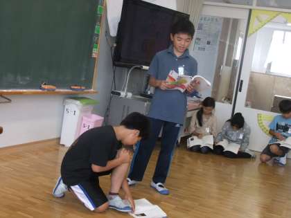 国語では、狂言「しびり」の学習をしています。狂言独特の言い回しを練習し、発表会をしています。皆、動作も工夫して発表をしています。