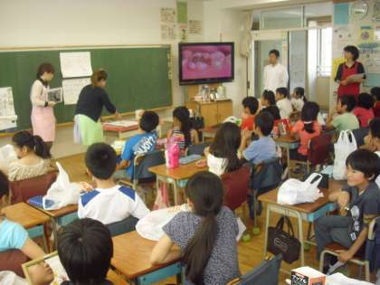 3年生の歯磨き指導がありました。歯科校医の小島正敬先生のご指導のもと、虫歯のできるまでについてや、虫歯になりやすい食べ物について学習し、歯磨きの仕方の指導を受けました。