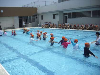 水は冷たかったですが、1年生の子どもたちは元気いっぱい水遊びをしました。