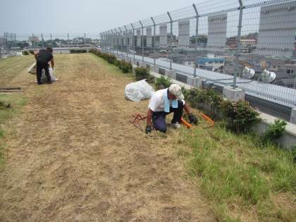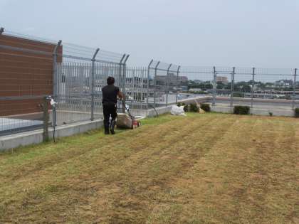 校舎の屋上も芝生になっています。第二校庭と違い今年は屋上に冬芝の種をまきました。そうするとみるみる成長し40センチほどに伸びてしまいました。さあて、芝刈りが大変です。機械が使えないので鎌を使い手で芝刈りを最初はしていました。大変でした。しかし、鎌で刈った後は芝刈り機で芝刈りです。芝生の管理維持はなかなか難しいものがあります。〈校長 箭内〉