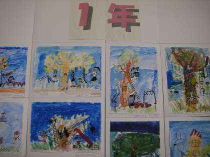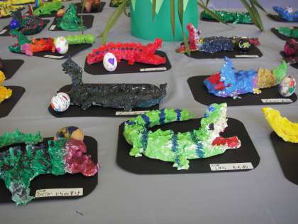 6日、今日からワンダーランド、展覧会です。これは1年生の絵と1年生の立体、ワニです。見応えがあります。2年生の絵はザリガニです。