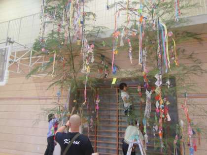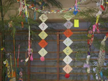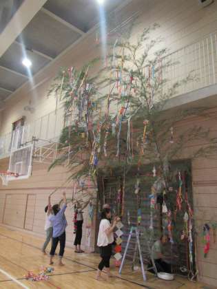 七夕の飾りは6月21日〈土〉の「このゆびとまれ」で作りました。3日の午後に竹に飾り付けです。今年も大きな竹を高橋佳一さんが持ってきてくれました。毎年外のさくら通りのポールに竹をとりつけていますが、今回は体育館にしました。雨が降ってきそうだからです。体育館にして正解でした。4日の金曜日は雨がふってきました。願い事の中に「コロコロをいっぱい買えますように」とか「家族で楽しくすごしたい」と書かれていました。〈校長 箭内〉