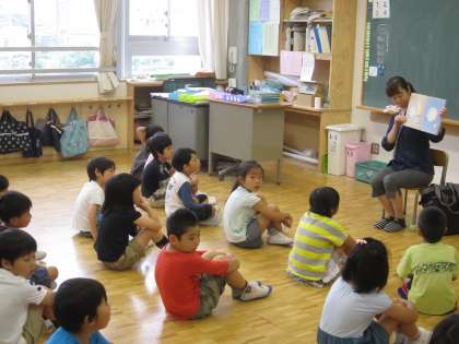 京西文庫プロジェクトで、お母さんの読み聞かせが始まりました。1年1組では、まんまる家族に産まれた四角の「かっくん」を読んでいただきました。みんな静かに聞いていました。