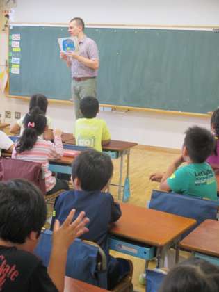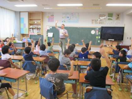 1年生が、初めての英語活動をしました。あいさつの仕方、天気を表す言葉、I like ○○(動物の名前)などを学習していました。