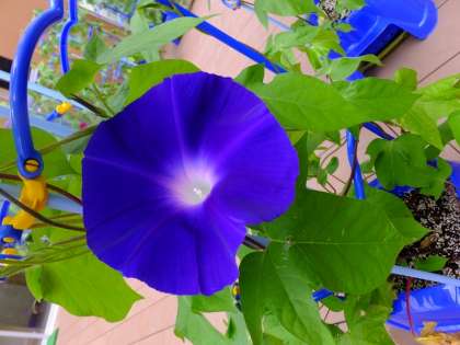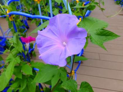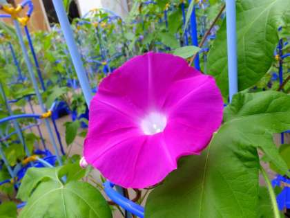 1年生の育てているあさがおですが、どんどん大きくなってきれいな花を咲かせています。様々な色のあさがおがあり、廊下からもとてもきれいに見えます。