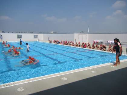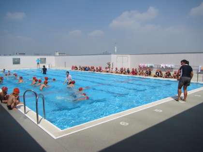 今日も快晴です。プールで水泳をしている子供たちは気持ちが良さそうです。今日は1年生のプールでした。島崎副校長先生が指導しています。いち、にい、さ-んのリズムでけのびをしたり、水の中に顔をつけたりしています。みな楽しそうです。夏にもプールにいっぱいはいってほしいと願っています。〈校長 箭内〉