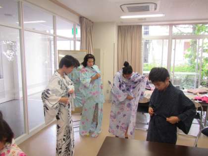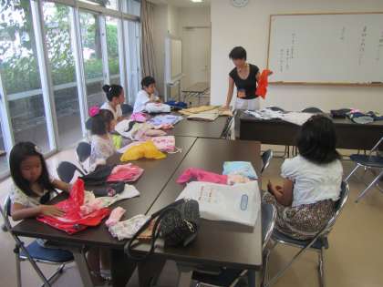 今日の京西アカデミーは「夏だ!祭りだ!浴衣だ!」ということで浴衣の着付けです。その前に帯等の説明がいろいろとありました。日本の着物を自分で着れるようになったら素敵です。まずは浴衣からです。浴衣や様々なものを持ってくるだけでも大変なことだったと思います。子供たちが浴衣を着るととてもかわいいのです。〈校長 箭内〉