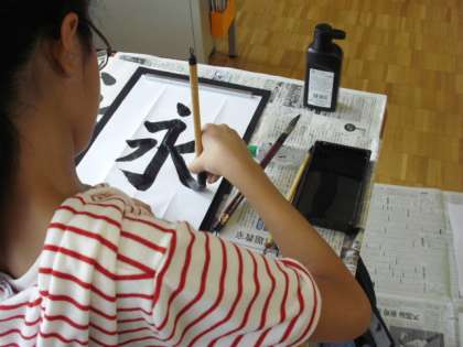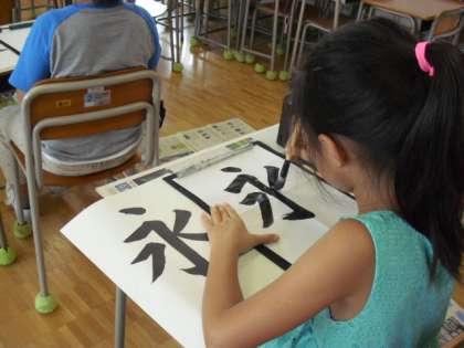 京西アカデミー「書道を楽しもう」です。指導は久保教諭です。真剣な雰囲気が漂います。姿勢、筆使いきちっとしています。筆の使い方の様々な技法が必要な「永」という文字です。頑張っています。楽しんでいます。書き終わった後のほっとした充実感がたまらないことでしょう。〈校長 箭内〉