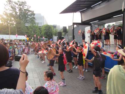 サマーステージに出演は4年生の「花笠踊り」です。ステージの上、ステージの下に分かれて思いっきり気合をこめて踊ります。額から汗がひたたり落ちています。京西小の4年生が頑張る姿を地域の方々に見ていただいて幸せでした。京西小学校自慢の4年生の踊りでした。〈校長 箭内〉