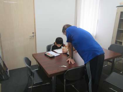 夏休みです。子供が一人で勉強しにきました。先生が丁寧に教えています。夏休みだからこそできることです。子供はえらいです。〈校長 箭内〉