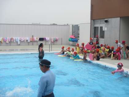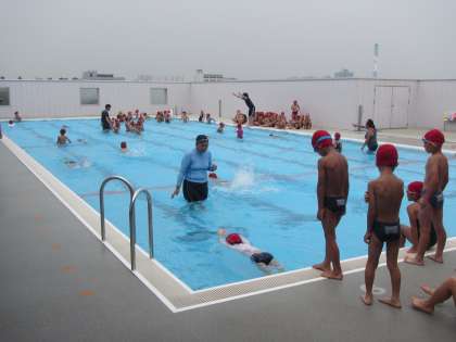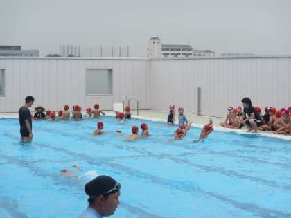 低学年の水泳には沢山の子供たちが参加しています。なかにはスイミングに通っている子もいるようです。全体指導の後は、級別に分かれて練習です。プールの縦を使い練習するグループ、プールの横を使って練習するグループ、縦の半分を使って練習するグループと分かれています。子供たちは涼しいプールで気持ちが良さそうです。〈校長 箭内〉